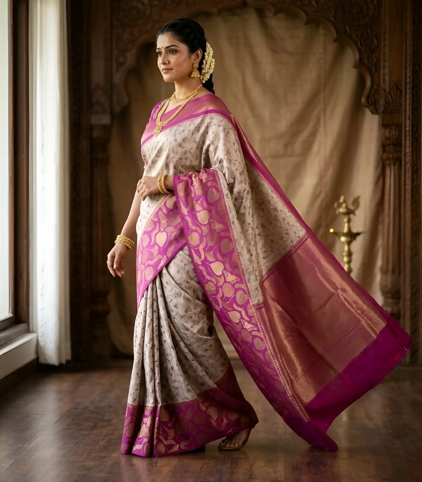Wedding Pure Silk Saree (Cream – Rani Pink)