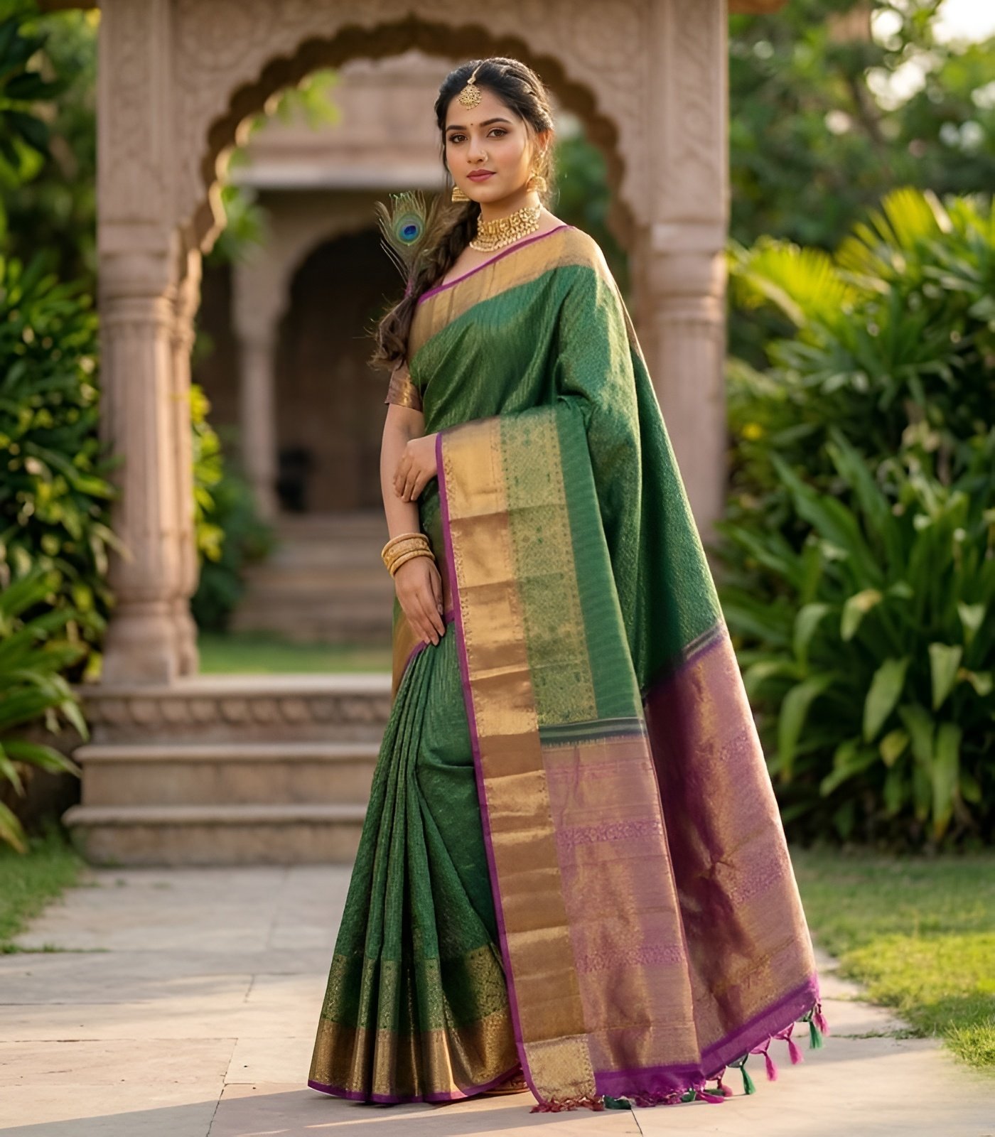 Wedding Pure Silk Saree (Dark Green – Magenta Pink)