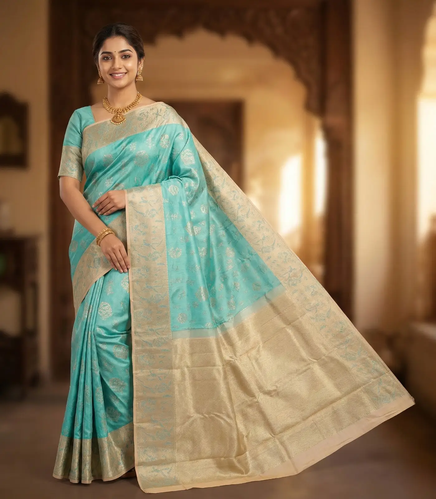 Wedding Pure Silk Saree (Sky Blue – Cream)